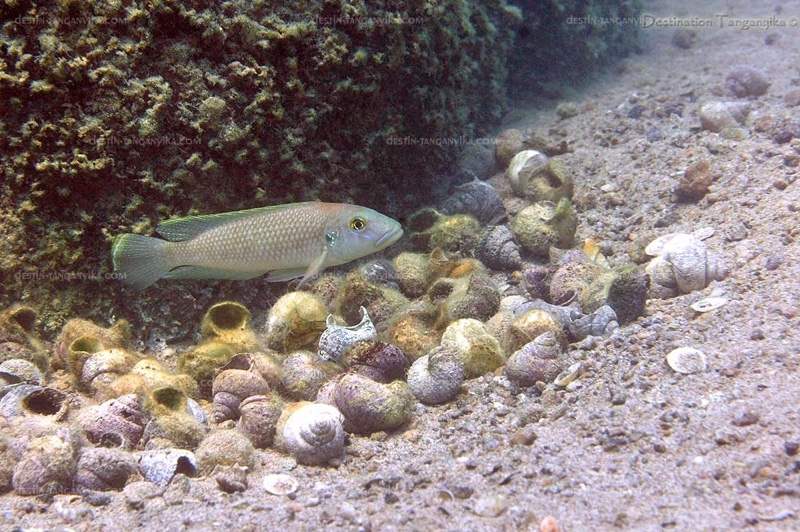Je prav gotovo eden izmed najbolj zanimivih Tanganjiških ostrižnikov. Lahko bi ga poimenovali tudi zbiratelj ali pa kradljivec polžjih hišic. Samec je namreč dovolj velik (doseže velikost 15 cm), da brez težav prenese polžjo hišico. Medtem ko so samice precej manjše, do 3x in dosežejo velikost do največ 6 cm. Torej je to ostrižnik, pri katerem je viden izrazit spolni dimorfizem, ki se odraža v velikosti samcev in samic. Takih samcev je večina, je pa zanimivo, da pri tej vrsti obstajajo tudi pritlikavi samci, ki pa ne zrastejo nič večji kot 4 cm. Kolikor je znano je tole edini primer polimorfizmosti samcev v smislu velikosti med Tanganjiškimi ostrižniki, je pa zanimivo, da samice zrastejo v obeh primerih normalno velike, ne glede na to, če je jajčeca oplodil običajen samec ali pa pritlikavi (velikost potomcev moškega spola pa je odvisna od tega, kateri samec je oplodil jajčeca).