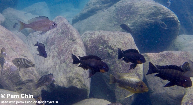 A foraging group of Tropheus sp. “Mpimbwe” (“Red Cheek”) in the shallows at Katondo Point, Cape Mpimbwe.