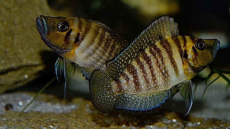 Jamo oz. kak prostor med kamenjen za drst izbere samica in sicer tako, da lahko vstopi le ona, samec pa ne. Samica položi od 50-200 iker v votlino, ki jih samec oplodi kar od zunaj s spušanjem sperme v jamo. Ličinke se izležejo v 3 dneh, splavajo pa v 5-7 dneh, takrat se jih lahko tudi začne hraniti z artemijo. Za jajčeca in kasneje za mladice skbi samica, medtem ko samec čuva prostor pred jamo a pogosto izgine še preden mladice splavajo.