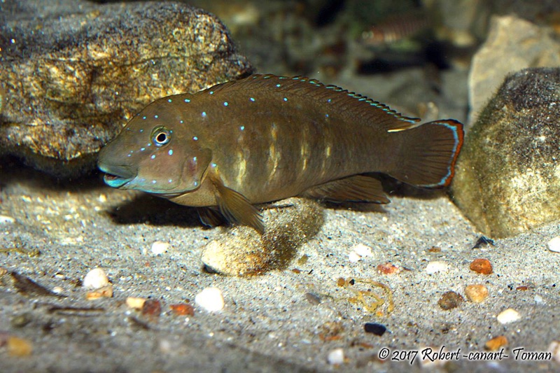 Ustonoša. Jajčeca in kasneje mladice nosita oba starša. Med samcem in samico ni vizualnih razlik (razen, da je samica manjša). Ko se par formira ta ostane ponavadi skupaj vse življenje. Teritorij branita oba starša. Drst se zgodi na ravni oz. na rahlo nagnjeni skali. Samica odloži jajčeca in jih pobera v usta, zatem pa še samec spusti spermo, ki jo samica prav tako z usti pobere. Torej so jajčeca oplojena znotraj ust samice. Ta postopek se nadaljuje dokler samica ne odloži in pobere vseh jajčec v usta. Samica nato nosi jajčeca oz. mladice približno 10 do 14 dni (do velikosti nekje 8 do 10 mm), nato pa jih preda samcu, ki jih nosi še nadaljnih 7 do 8 dni. Pred to predajo se zdi, kot da se bo zgodila ponovna drst, saj par odganja stran vsiljivce, saj želi na teritoriju zagotoviti varno predajo mladic. Par ostane skupaj ves čas ko nosi mladice en oz. drugi od staršev. Tisti, ki nosi ne je, drugi pa se normalno prehranjuje. Število mladic je ponavadi nekje do 35. Ko samec mladice izpusti jih več nobeden od staršev ne varuje in jih ignorirata.