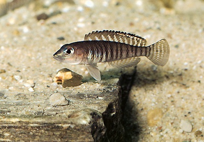 Samci so večji od samic. So ena izmed redkih vrst lamprologinov, pri kateri so samice lepše obarvane od samcev. In sicer so samice rumeno bež barve z oranžnim trebuhom, na hrbtni plavuti pa imajo črno-belo označbo. Samci so podobne bež barve, po celem telesu pa imajo temnejše proge (podobno kot L. laparogramma). Po teh progah pri samcih se ti dve vrsti tudi najbolj ločita od L. kungweensis.