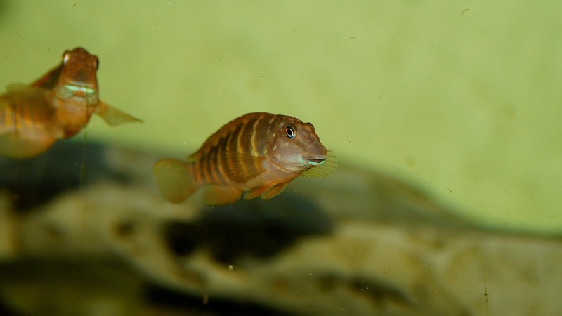 Ustonoša. Jajčeca in kasneje mladice nosita oba starša. Med samcem in samico ni vizualnih razlik (razen, da je samica manjša). Ko se par formira ta ostane ponavadi skupaj vse življenje. Teritorij branita oba starša. Drst se zgodi na ravni oz. na rahlo nagnjeni skali. Samica odloži jajčeca in jih pobera v usta, zatem pa še samec spusti spermo, ki jo samica prav tako z usti pobere. Torej so jajčeca oplojena znotraj ust samice. Ta postopek se nadaljuje dokler samica ne odloži in pobere vseh jajčec v usta. Samica nato nosi jajčeca oz. mladice približno 10 do 14 dni (do velikosti nekje 8 do 10 mm), nato pa jih preda samcu, ki jih nosi še nadaljnih 7 do 8 dni. Pred to predajo se zdi, kot da se bo zgodila ponovna drst, saj par odganja stran vsiljivce, saj želi na teritoriju zagotoviti varno predajo mladic. Par ostane skupaj ves čas ko nosi mladice en oz. drugi od staršev. Tisti, ki nosi ne je, drugi pa se normalno prehranjuje. Število mladic je ponavadi nekje do 35. Ko samec mladice izpusti jih več nobeden od staršev ne varuje in jih ignorirata.