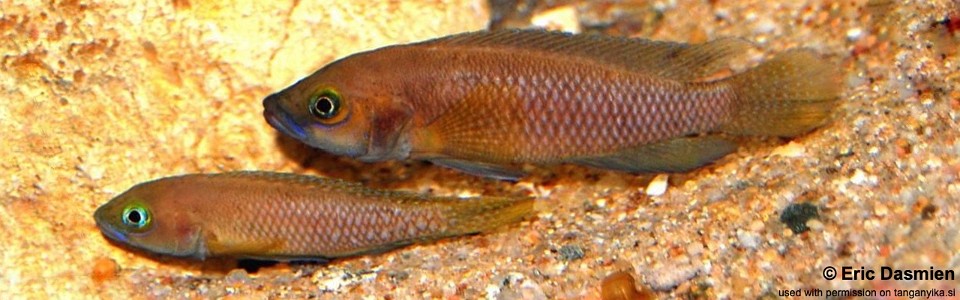 Samci so večji od samic. Razlika pa je še v obarvanosti, saj so samci obarvani rjavo-črno, samice pa rumeno-oranžno. So tako eni izmed redkih lamprologinov, kjer se razlikujejo samci in samice v obarvanosti oz. so pravzaprav poleg Telmatochromis sp. 'dhonti yellow' trenutno edini znani lamprologini, kjer se spola razlikujeta po obarvanosti.