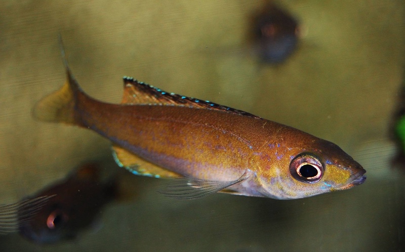 Materinska ustonoša. Samec vzdržuje tri-dimenzionalni teritorij v odprtih vodah in poizkuša privabiti samice, ki plavajo mimo na parjenje. Če se samica odzove samec upogne telo in začne tresti trebušni plavuti. Ko se samica dodakne trebušne plavuti, samec izpusti spermo, samica pa hitro odloži jajčece (ali več teh) in jih takoj za tem pobere v usta. Tole se nadaljuje, dokler samica ne odloži vseh jajčec. Jajčec je ponavadi zelo malo (od 5 do 10). Samica nosi jajčeca približno tri tedne.